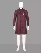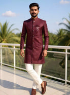 Dashing wine-toned Semi-Indo set with self floral jacquard—where deep hues meet intricate textures. Stylishly tailored for evening revelry with a graceful, festive aura.